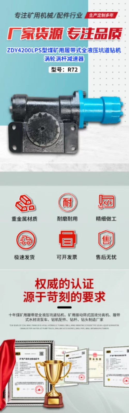 該產(chǎn)品為煤礦用履帶鉆機(jī)配件渦輪蝸桿減速器,采用的CNC精加工,結(jié)構(gòu)緊密無(wú)縫隙,齒輪材料減速殼體球墨鑄鐵材質(zhì)更為堅(jiān)固耐磨 不易腐蝕,表面做了噴漆處理,選用的進(jìn)口油漆不易掉色,增加了產(chǎn)品的防腐防銹能力,更能防止全身靜電產(chǎn)生火花造成危險(xiǎn)。